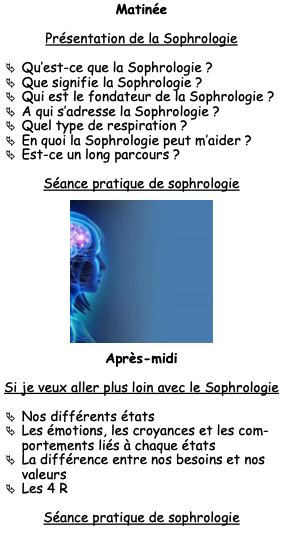 La journée suivra un plan en 4 parties. Une formation théorique suivie d’une séance de sophrologie pratique le matin puis l’après-midi.
